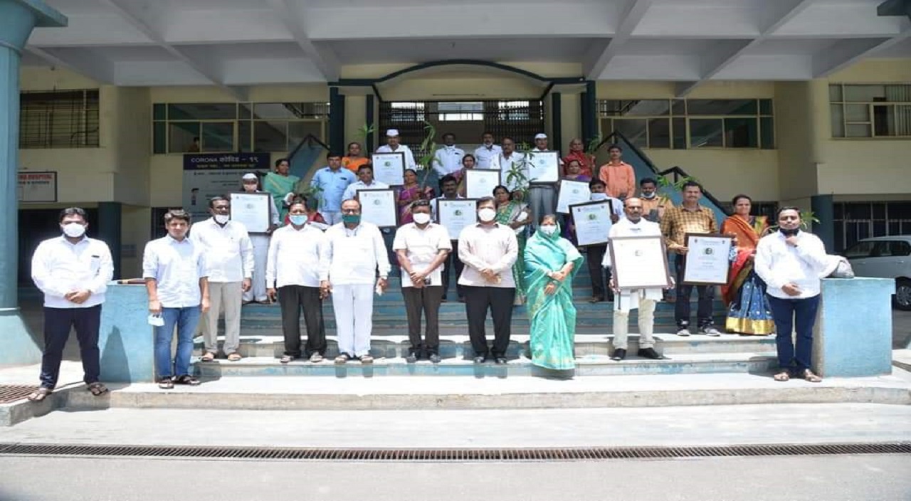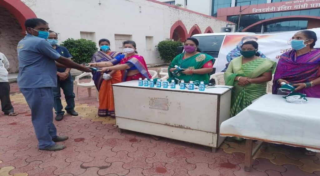 Sangamner Municipal Council’s Mayor Mrs. Durgatai Tambe’s birthday was celebrated by donating sanitizers and masks to the health workers of the Municipal Council on behalf of Jaihind Mahila Manch.